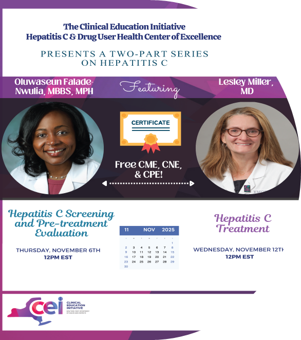 Clinical Education Initiative (CEI), a New York State Department of Health AIDS Institute program, offers progressive continuing medical education to physicians, nurse practitioners, physician assistants, nurses, dentists, and pharmacists to enhance their capacity to deliver high-quality healthcare services and to improve patient health outcomes. We offer free, CE accredited, online and live trainings, conferences, intensive preceptorships, clinical technical assistance (TA) and tools, on HIV Primary Care and Prevention, Sexual Health, Hepatitis C treatment, and Drug User Health.